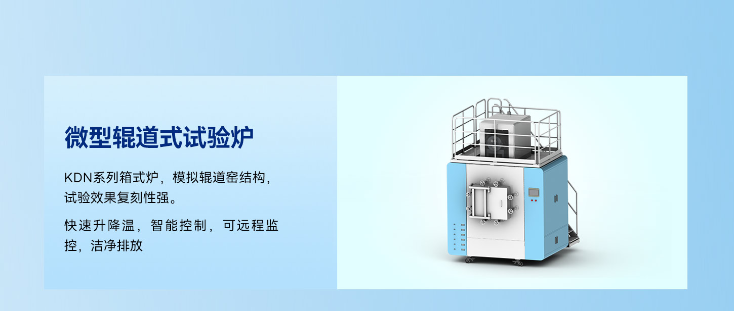 KDN系列箱式炉,模拟辊道窑结构,试验效果复刻性强; 快速升降温,智能控制,可远程监控,洁净排放。