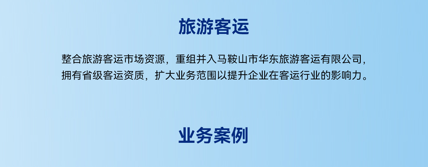 整合旅游客运市场资源,重组并入马鞍山市华东旅游客运有限公司,拥有省级客运资质,扩大业务范围以提升企业在客运行业的影响力。