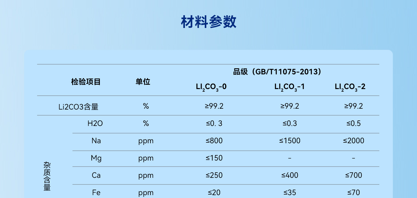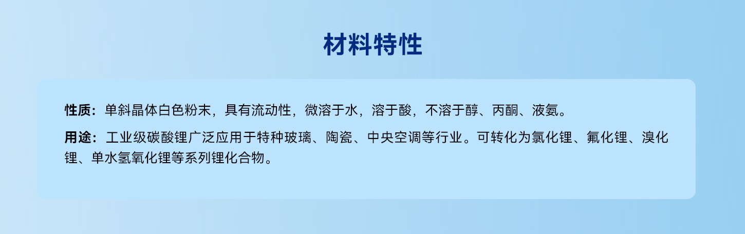 化学式:Li2CO3 分子量:73.89 CAS-No.:554-13-2 密度:2.11g/cm3 熔点:720℃ 沸点:1230℃
