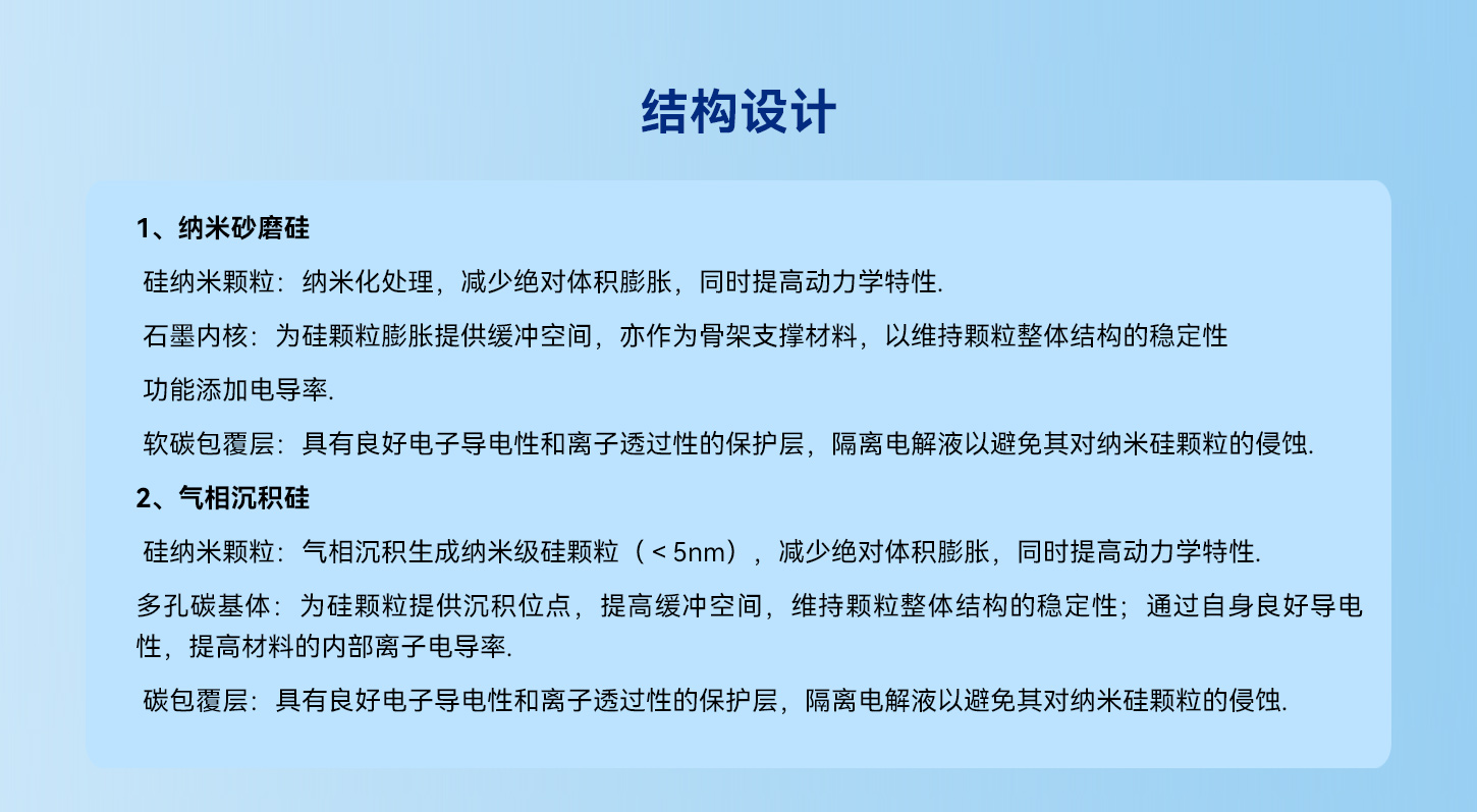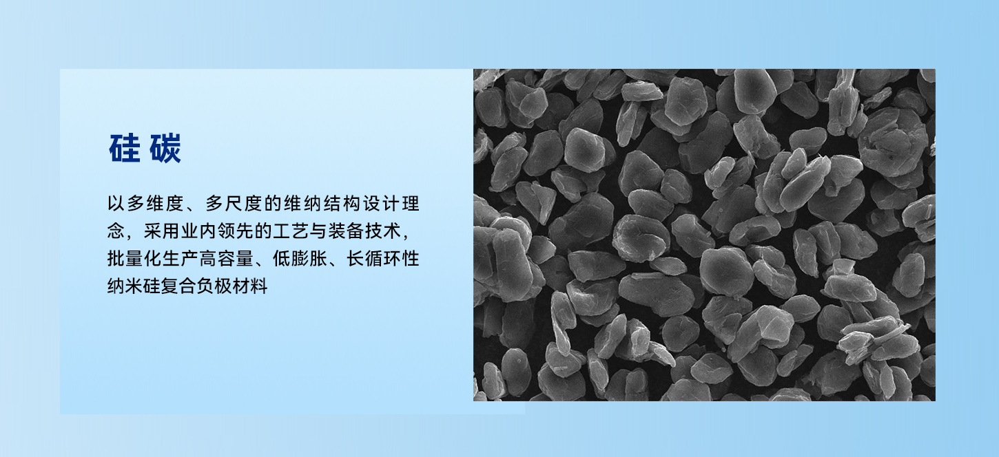 以多维度、多尺度的维纳结构设计理念,采用业内领先的工艺与装备技术,批量化生产高容量、低膨胀、长循环性纳米硅复合负极材料