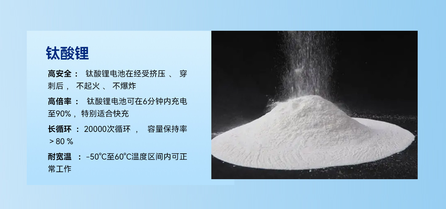 高安全 : 钛酸锂电池在经受挤压 、 穿刺后 , 不起火 、 不爆炸 高倍率 : 钛酸锂电池可在6分钟内充电至90% ,特别适合快充 长循环 :20000次循环 , 容量保持率>80 % 耐宽温 :-50°C至60°C温度区间内可正常工作