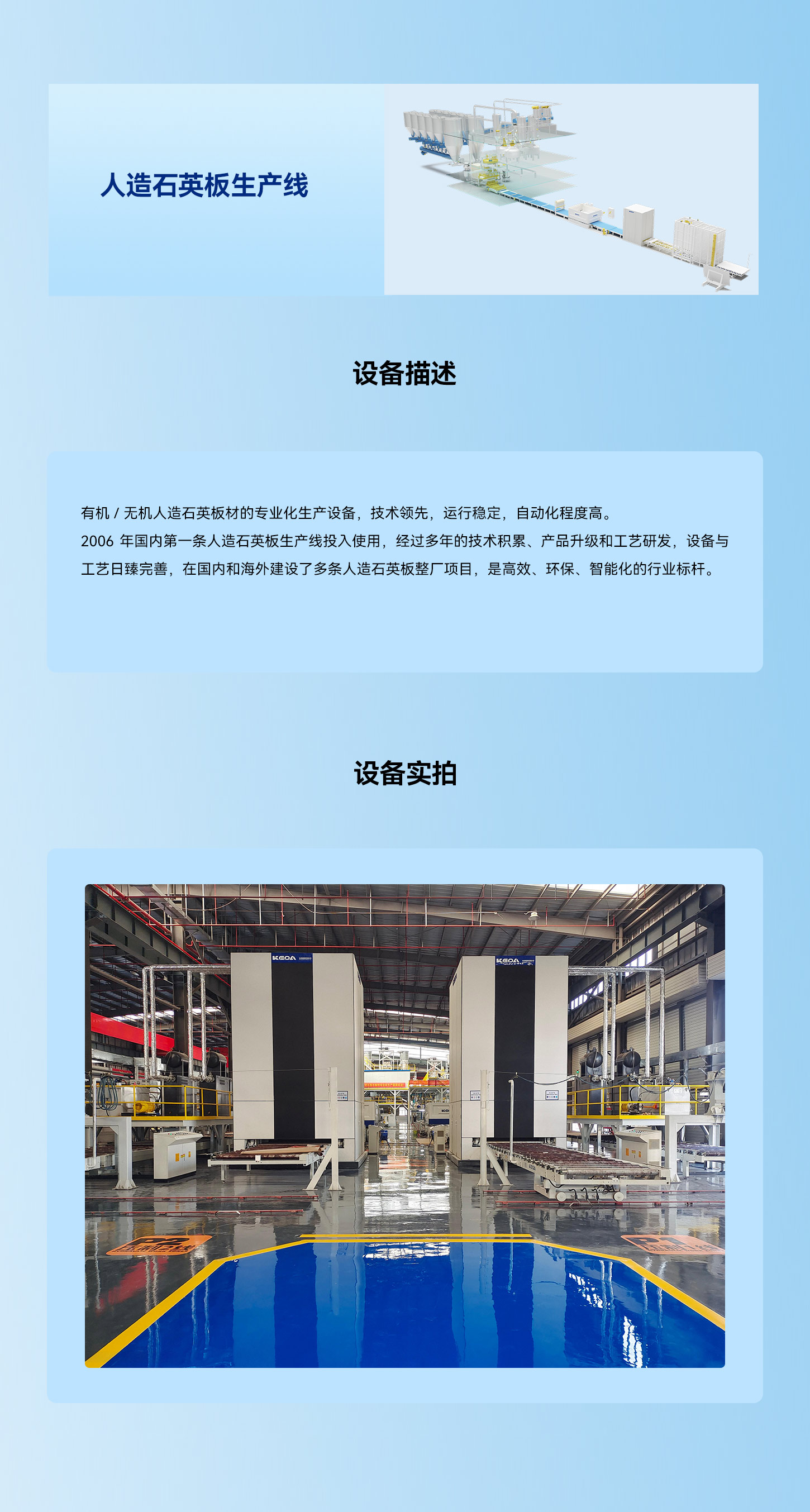 有机 / 无机人造石英板材的专业化生产设备,技术领先,运行稳定,自动化程度高。2006 年国内第一条人造石英板生产线投入使用,经过多年的技术积累、产品升级和工艺研发,设备与工艺日臻完善,在国内和海外建设了多条人造石英板整厂项目,是高效、环保、智能化的行业标杆。