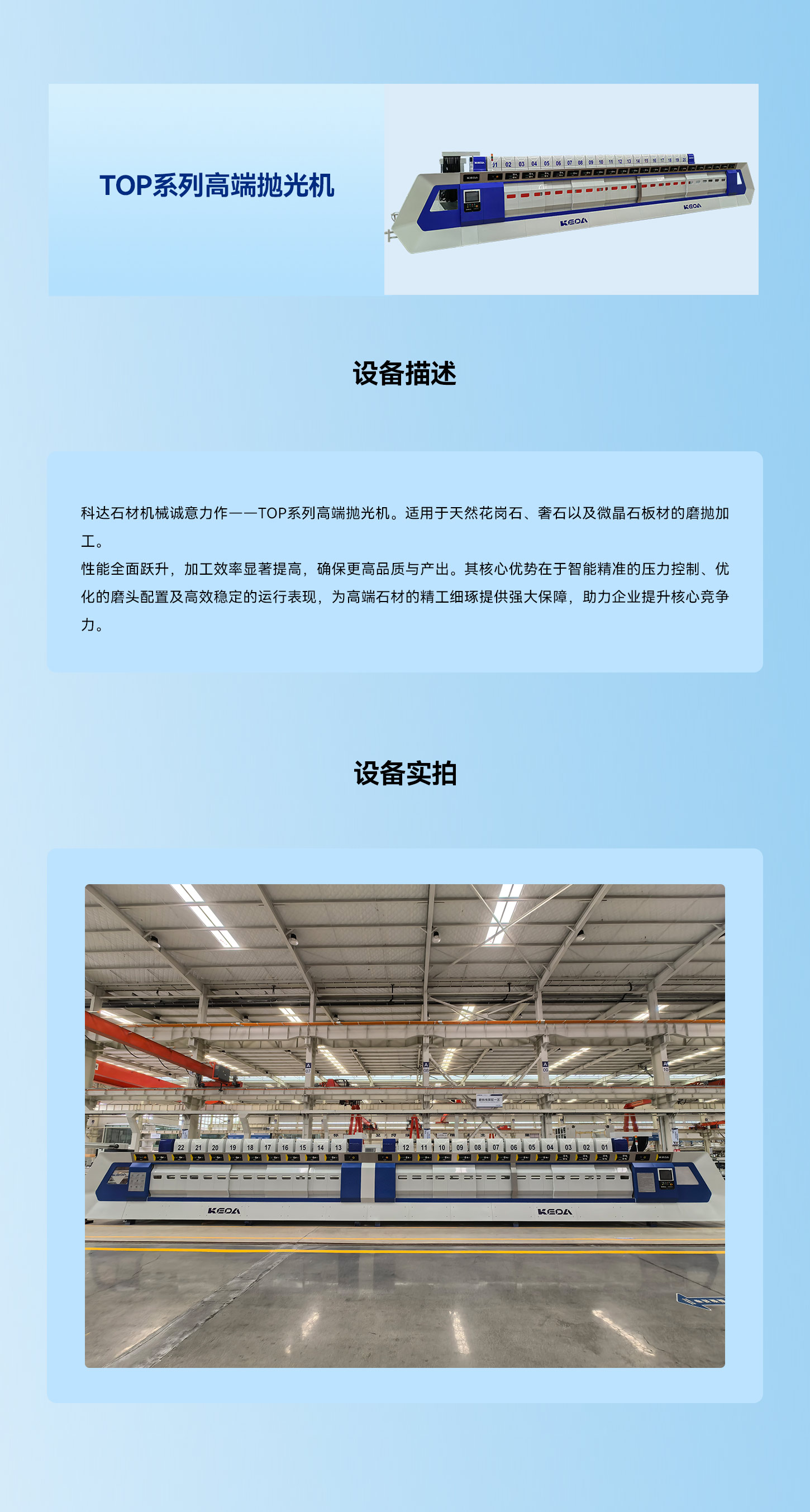 爱游戏(中国)石材机械诚意力作——TOP系列高端抛光机。适用于天然花岗石、奢石以及微晶石板材的磨抛加工。 性能全面跃升,加工效率显著提高,确保更高品质与产出。其核心优势在于智能精准的压力控制、优化的磨头配置及高效稳定的运行表现,为高端石材的精工细琢提供强大保障,助力企业提升核心竞争力。